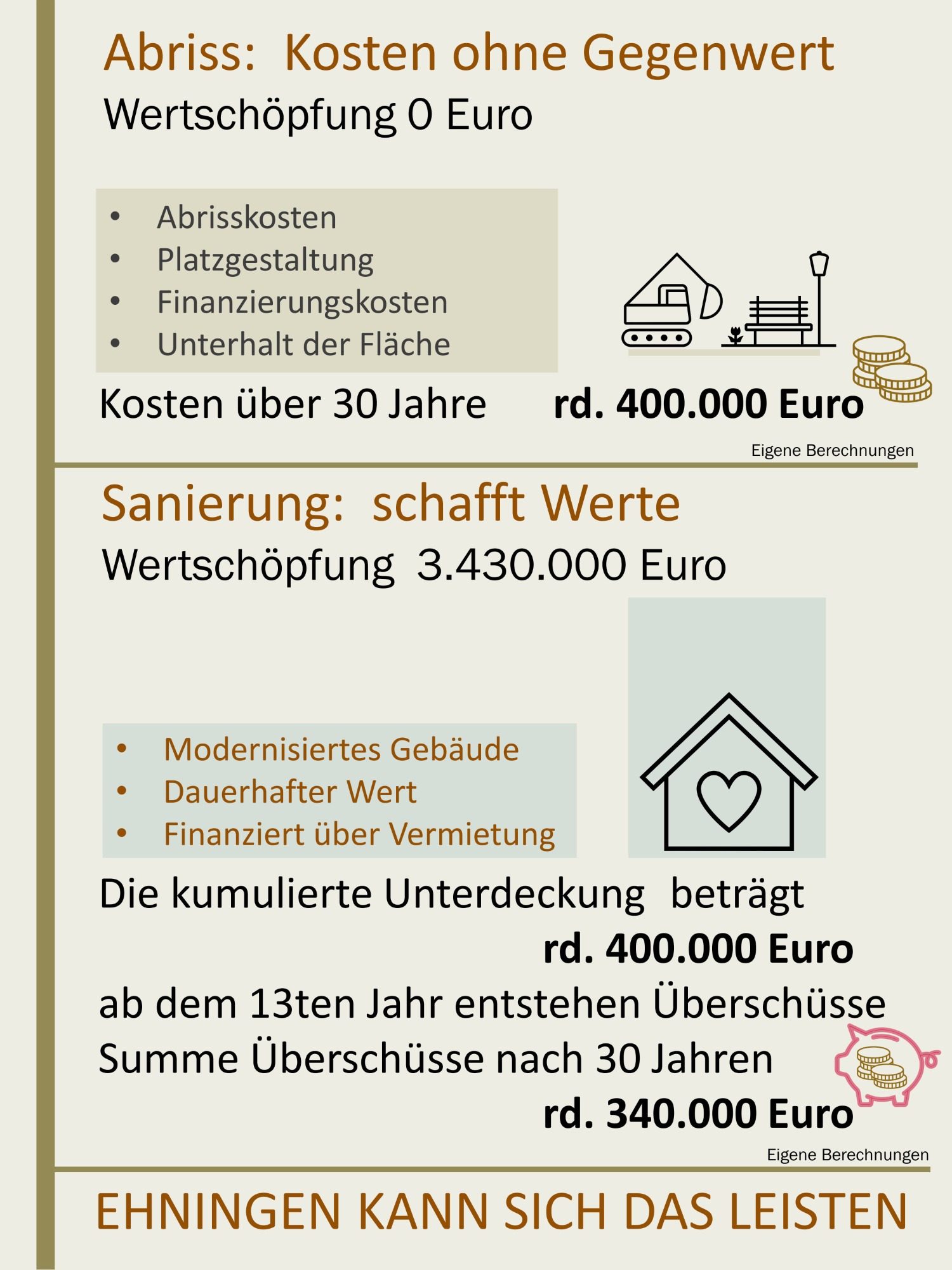 Sanieren statt abreißen spart Geld und erhält Werte! Wir stehen vor der Entscheidung, ob wir über 400.000 Euro in einen leeren Platz investieren – oder in ein werthaltiges Gebäude. Diese Kosten entstehen so oder so, aber nur die Sanierung schafft echten Mehrwert für Ehningen. Wie kommen wir zu unserer Aussage?
