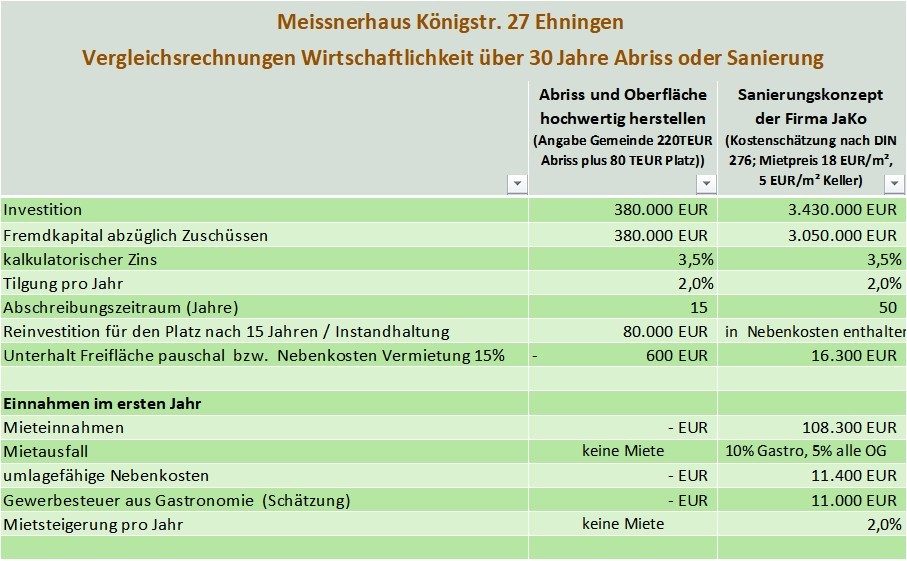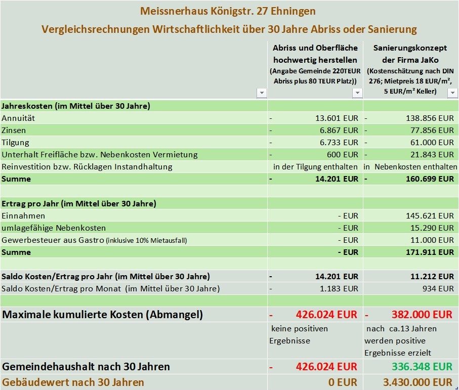 Die Entscheidung ist unseres Erachtens klar: Diese Kosten entstehen so oder so, aber nur die Sanierung des Meissnerhauses schafft zusätzlich einen echten Mehrwert von 3,4 Mio EUR Gebäudewert und eine nachhaltige Einnahmensituation aus dem Betrieb des Gebäudes für Ehningen. Fazit: