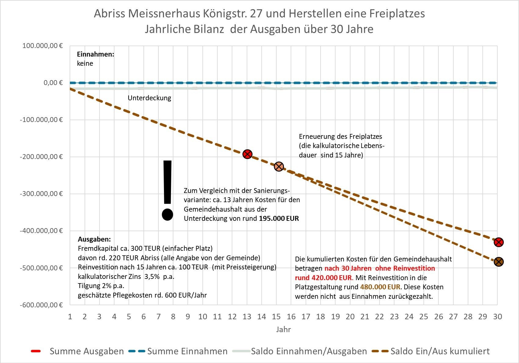 Anders stellt sich die wirtschaftliche Situation bei der Variante Abriss dar, da hier keine Einnahmen zu erwarten sind. Die Belastung (Abmangel) für die Gemeinde nimmt jedes Jahr zu und liegt bei rund 420 TEUR nach 30 Jahren. Die Reinvestition nach 15 Jahren muß ggf. in die Finanzierung mit einkalkuliert werden. Danach läge die Belastung für die Gemeinde nach 30 Jahren sogar bei 480 TEUR:
