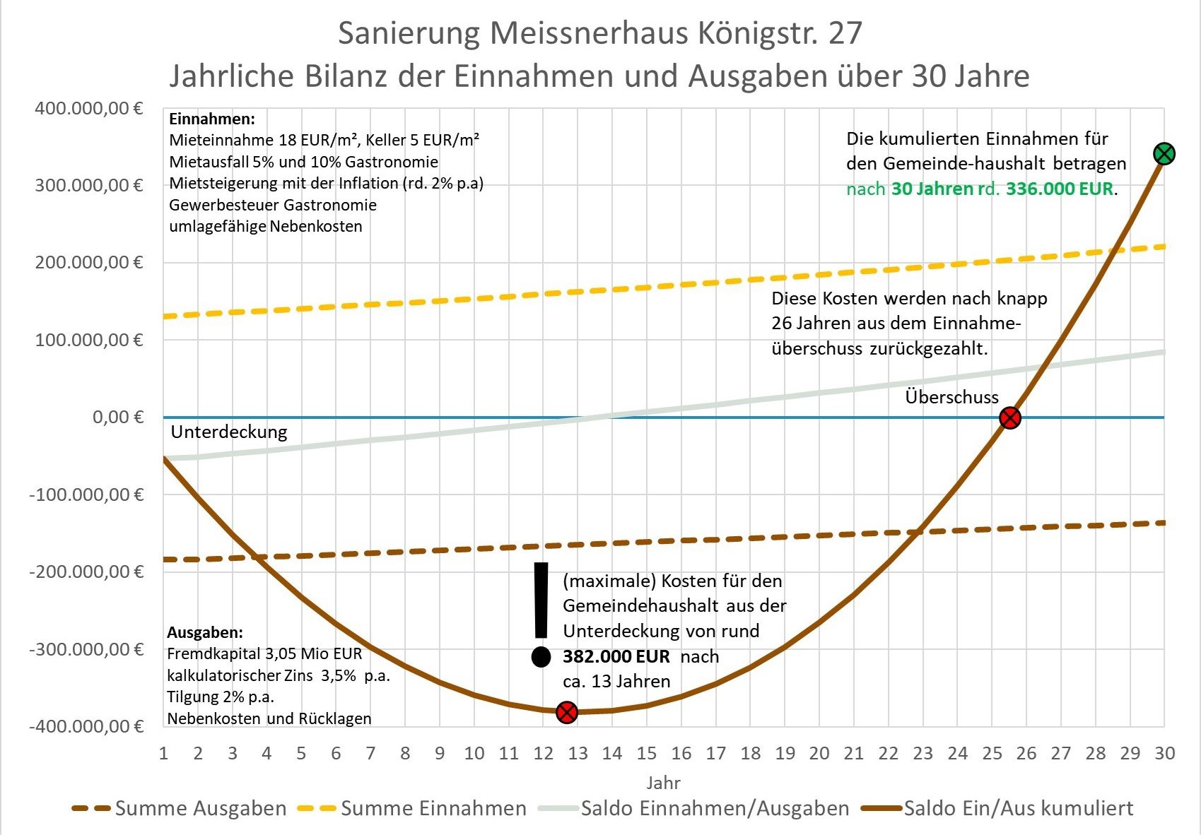 Selbst im Szenario „worst case“ bleibt, wenn auch über eine recht lange Dauer, die Wirtschaftlichkeit noch gegeben. Zudem steht mit 3,4 Mio EUR zusätzlich der Gebäudewert im Haushalt.